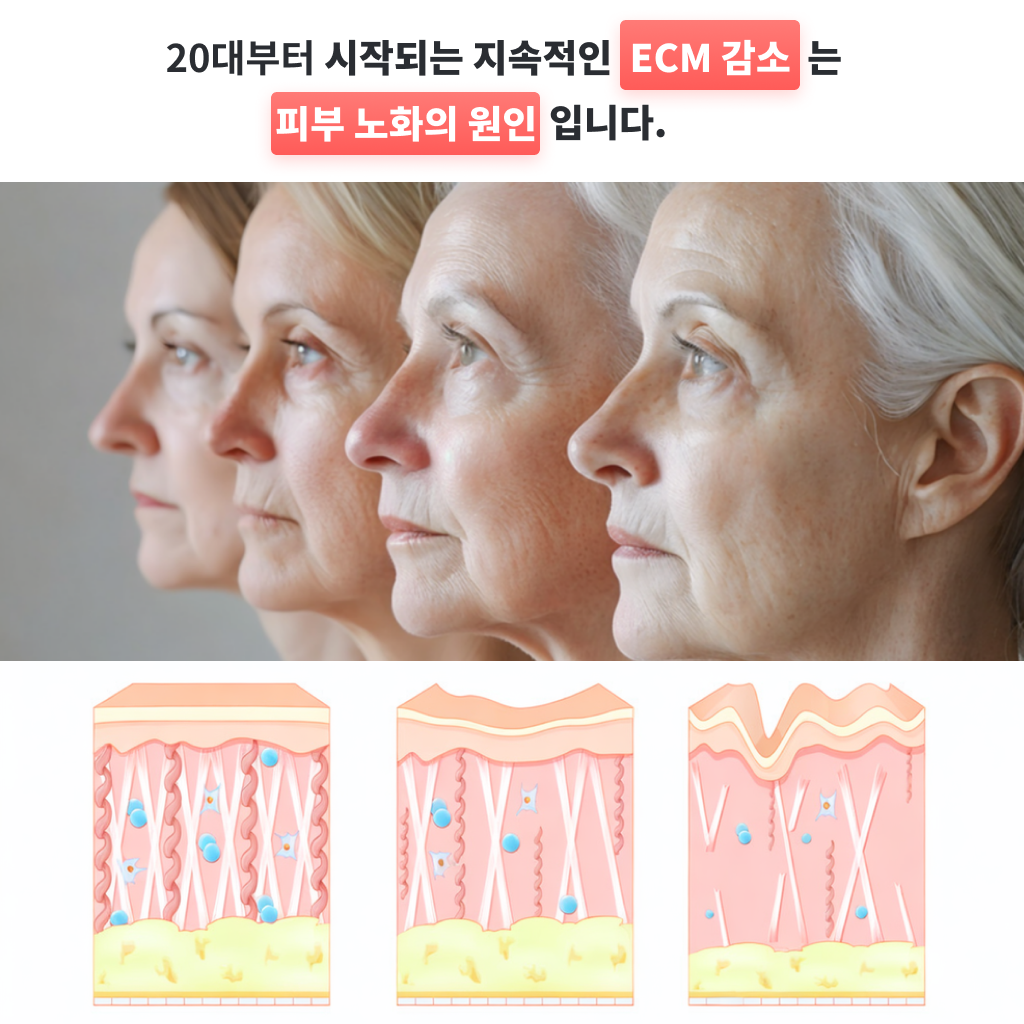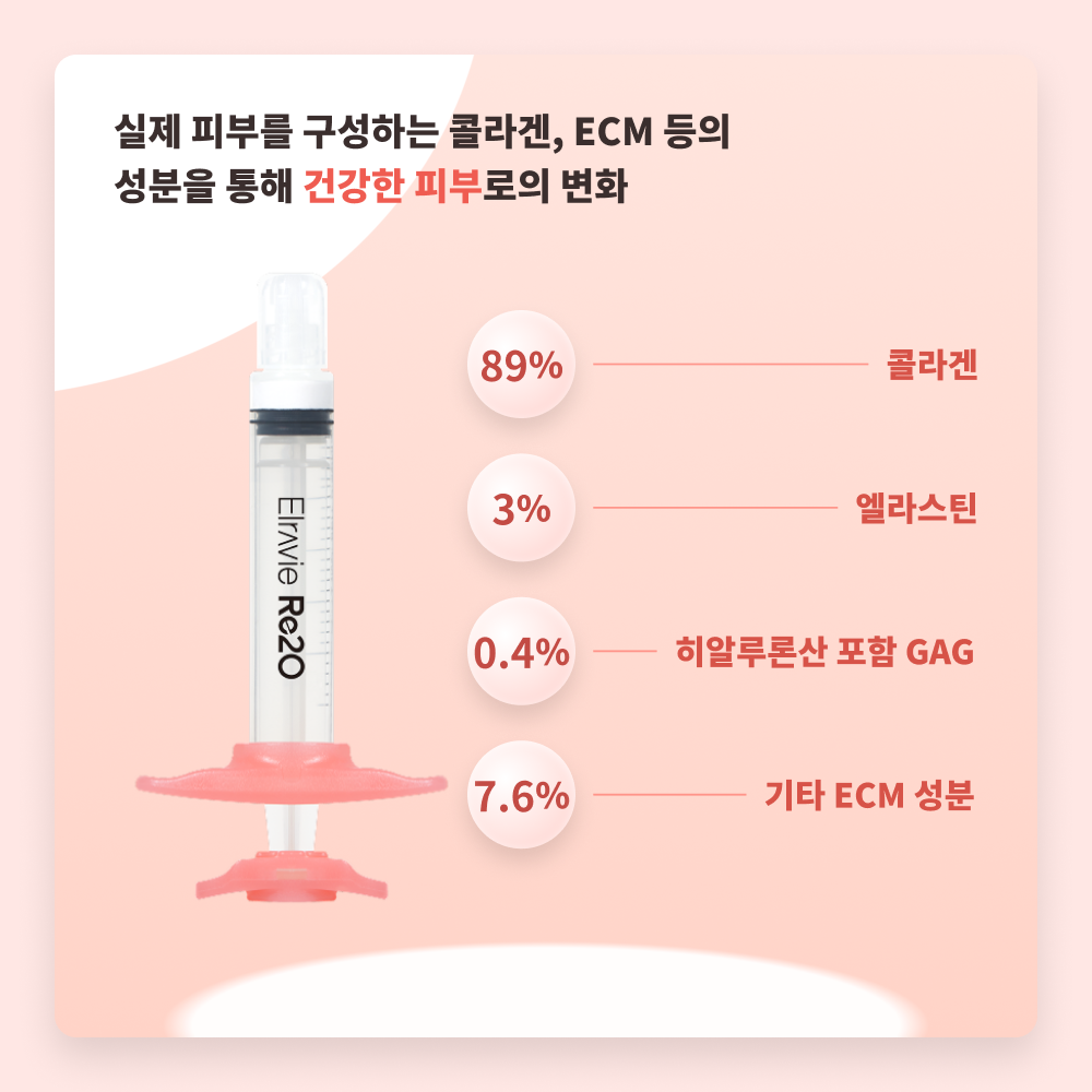 인체 무세포 동종진피(hADM)를 가공해 콜라겐, 엘라스틴, 피브로넥틴, 히알루론산 등 실제 피부를 구성하는 성분만 남긴 뒤, 피부에 직접 주입하는 ECM 재생 스킨부스터입니다.