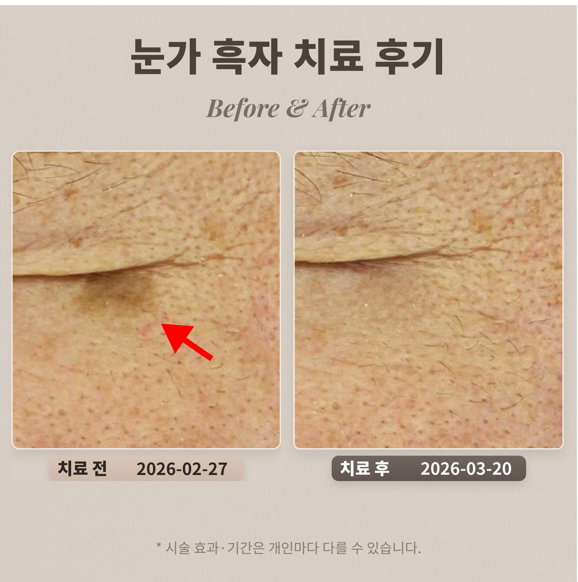 환자분께서는 눈가 주변에 비교적 크기가 큰 흑자가 자리잡고 있었습니다. 리팟레이저는 이러한 흑자의 멜라닌 색소를 선택적으로 파괴하여, 옅은 갈색부터 진한 갈색까지 다양한 깊이의 색소를 효과적으로 제거하는 데 유리합니다. 특히 크기와 모양이 불규칙하고 합쳐진 형태의 흑자에도 정교하게 접근하여, 주변 피부 손상을 최소화하면서 병변 부위만을 효과적으로 개선할 수 있습니다. 이를 통해 전반적으로 균일하고 깨끗한 눈가 피부 톤을 되찾는 데 도움을 드릴 수 있습니다.