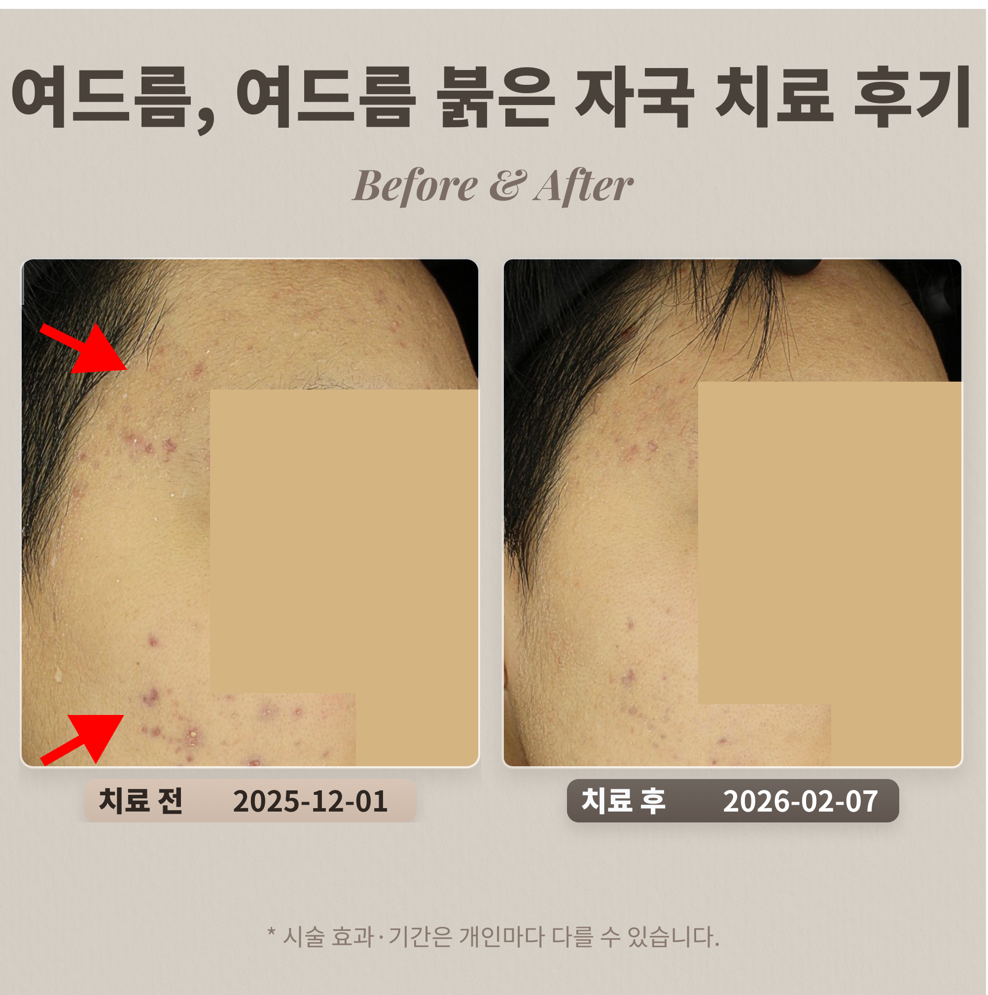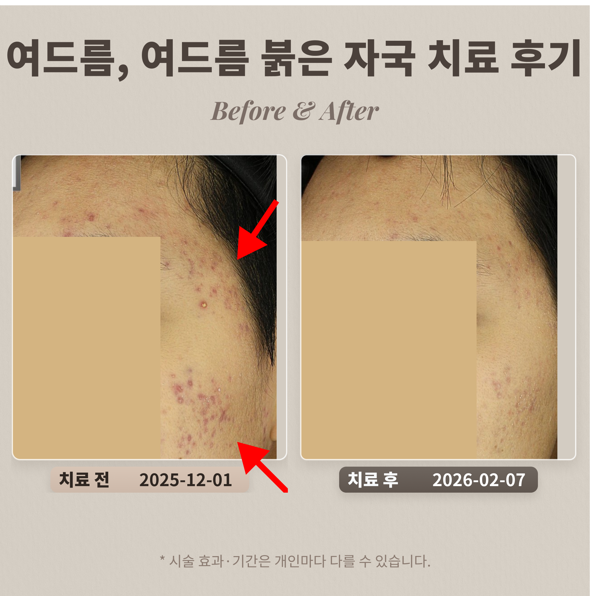 환자분은 활동성 염증성 여드름과 함께 광범위한 붉은 여드름 자국(염증 후 홍반)으로 인한 고르지 못한 피부 톤을 보이십니다. 여드름 복합 치료는 현재 진행 중인 염증성 구진 및 농포를 효과적으로 조절하여 여드름 발생을 억제하고 피부 진정을 돕습니다. 여기에 브이빔 레이저를 병행하면 붉은 여드름 자국(염증 후 홍반)의 혈관 병변을 선택적으로 치료하여 피부 붉은 기를 개선하고 전반적인 피부 톤을 균일하게 만드는 데 매우 효과적입니다. 이처럼 두 치료법의 시너지를 통해 활동성 여드름과 붉은 자국을 동시에 개선하여 깨끗하고 건강한 피부를 되찾으실 수 있습니다.