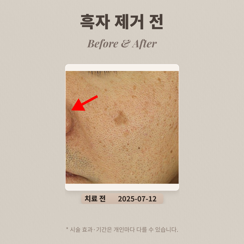 - 볼에 큰 흑자 존재 - 매번 해당 병변으로 거슬렸다고 함 - 흑자외에도 잡티가 많으셨으나 추후에 제거하기로 함