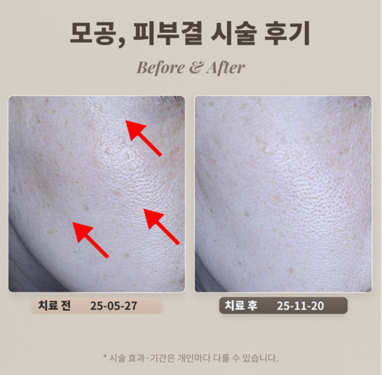 듀얼토닝 및 리바이브 시술 후, 전반적인 피부 탄력이 개선되어 넓어 보였던 모공이 수축된 양상을 보입니다. 또한 고르지 않던 피부결이 매끄러워졌으며, 칙칙했던 피부톤도 한층 맑고 균일해졌습니다.