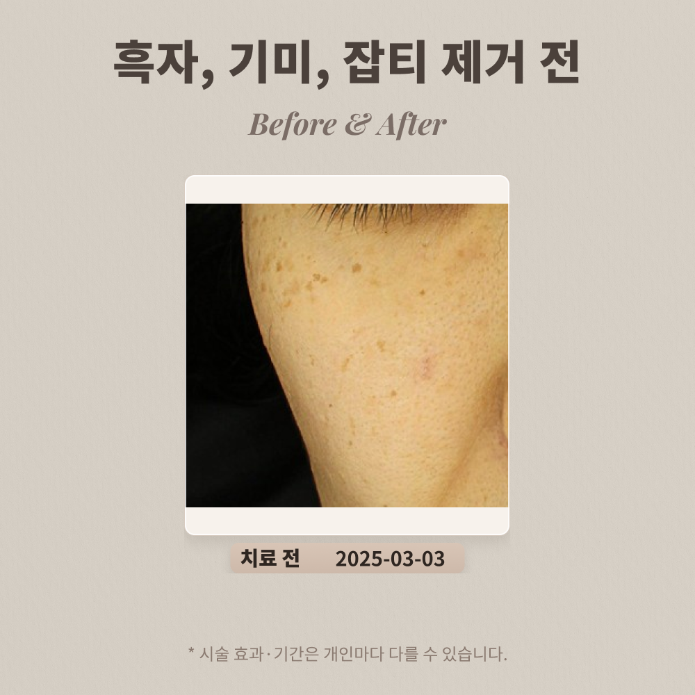 - 초기 치료로 흑자가 우선 사라짐 - 광대, 눈가 주변 잡티, 기미도 서서히 사라짐 - 피부톤도 맑아짐