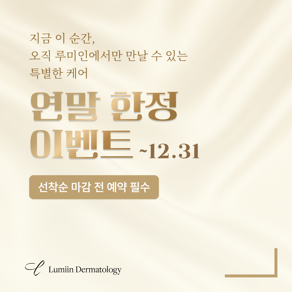 “피부가 푸석해 보여서 화장이 들뜨고, 사진 찍을 때 피부결이 신경 쓰인다”는 고민으로 내원하시는 분들이 많아지는 이유이기도 합니다. 강남 루미인 피부과에서는 이런 계절적 피부 변화를 한 번에 개선할 수 있도록, 보습 회복·피부결 정돈·탄력 개선을 중심으로 한 강남 피부과 연말 한정 이벤트를 준비했습니다.